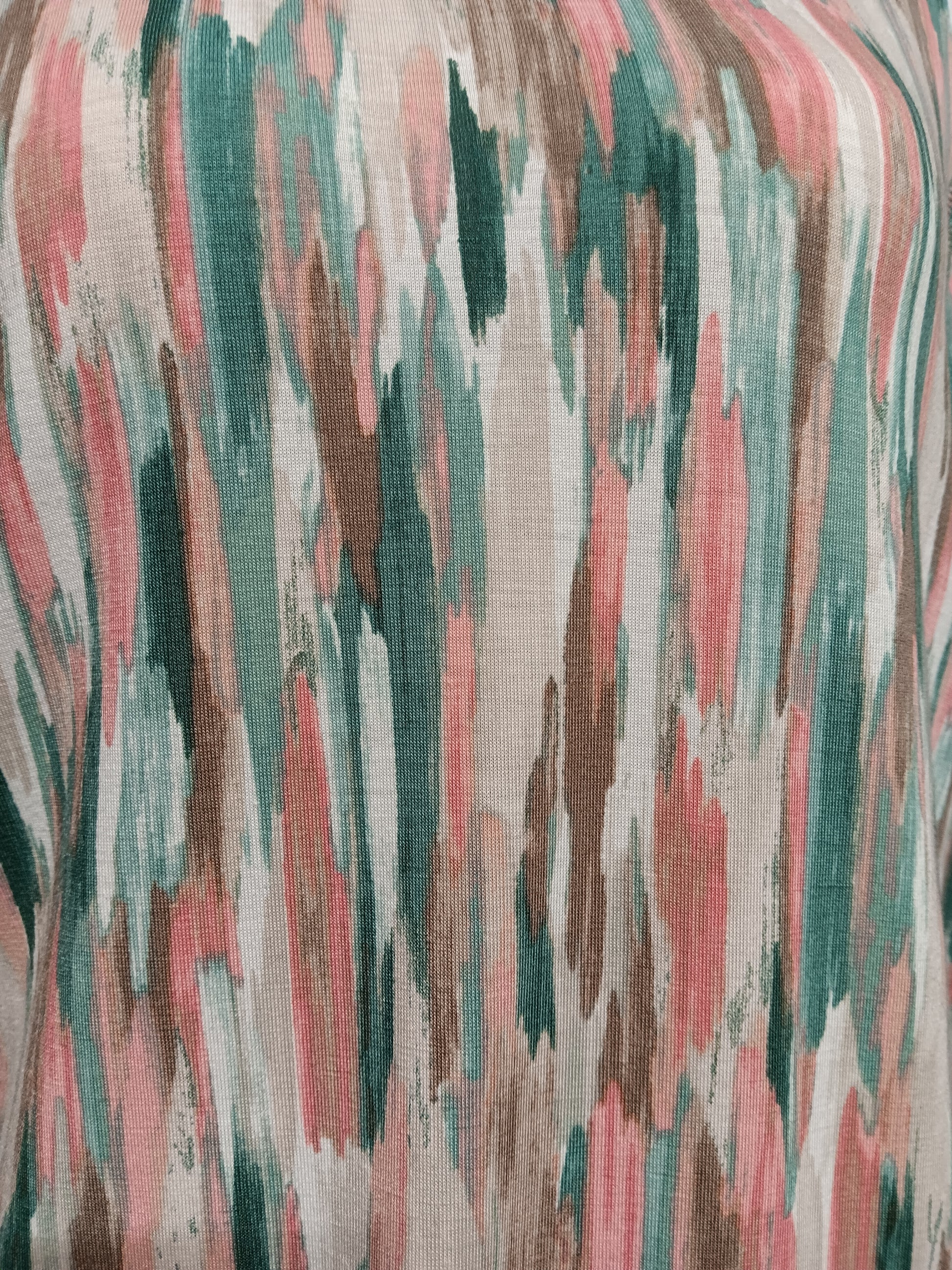 This Beige/Pink/Teal Brush Stroke Top is a flattering pick for a day out in springtime, with drawstrings along the hem to add a touch of elegance. Made with 95% Polyester and 5% Spandex. Machine wash, tumble dry low.