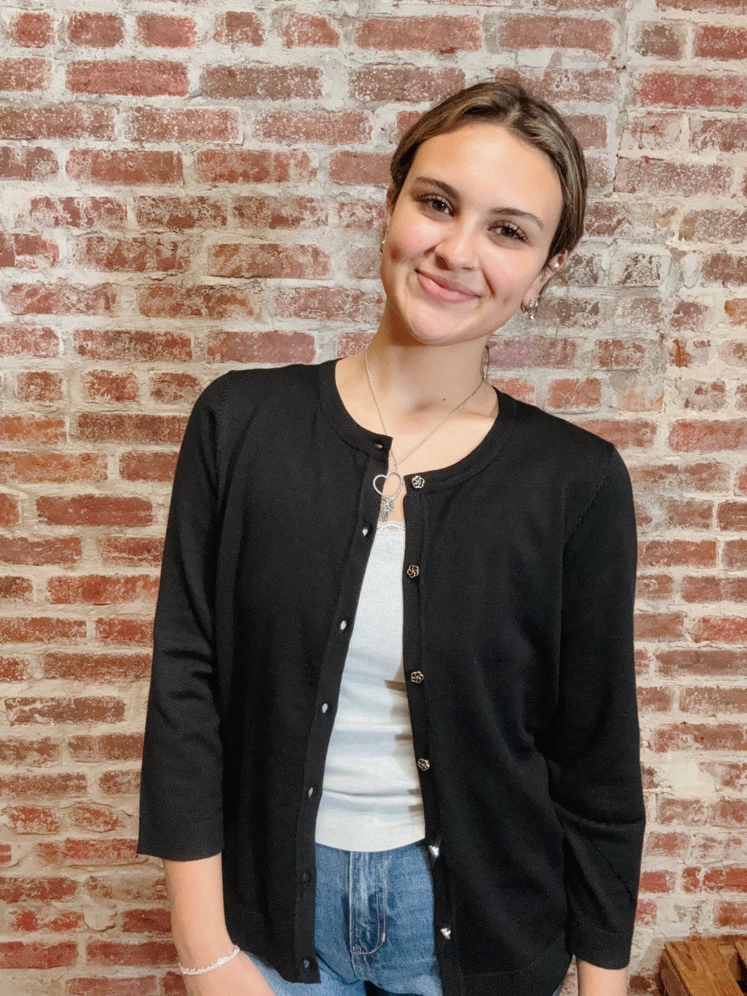 This light weight black cardigan is not only stylish, but also features charming flower button details. Keep your outfit on point without weighing yourself down. Perfect for any occasion!