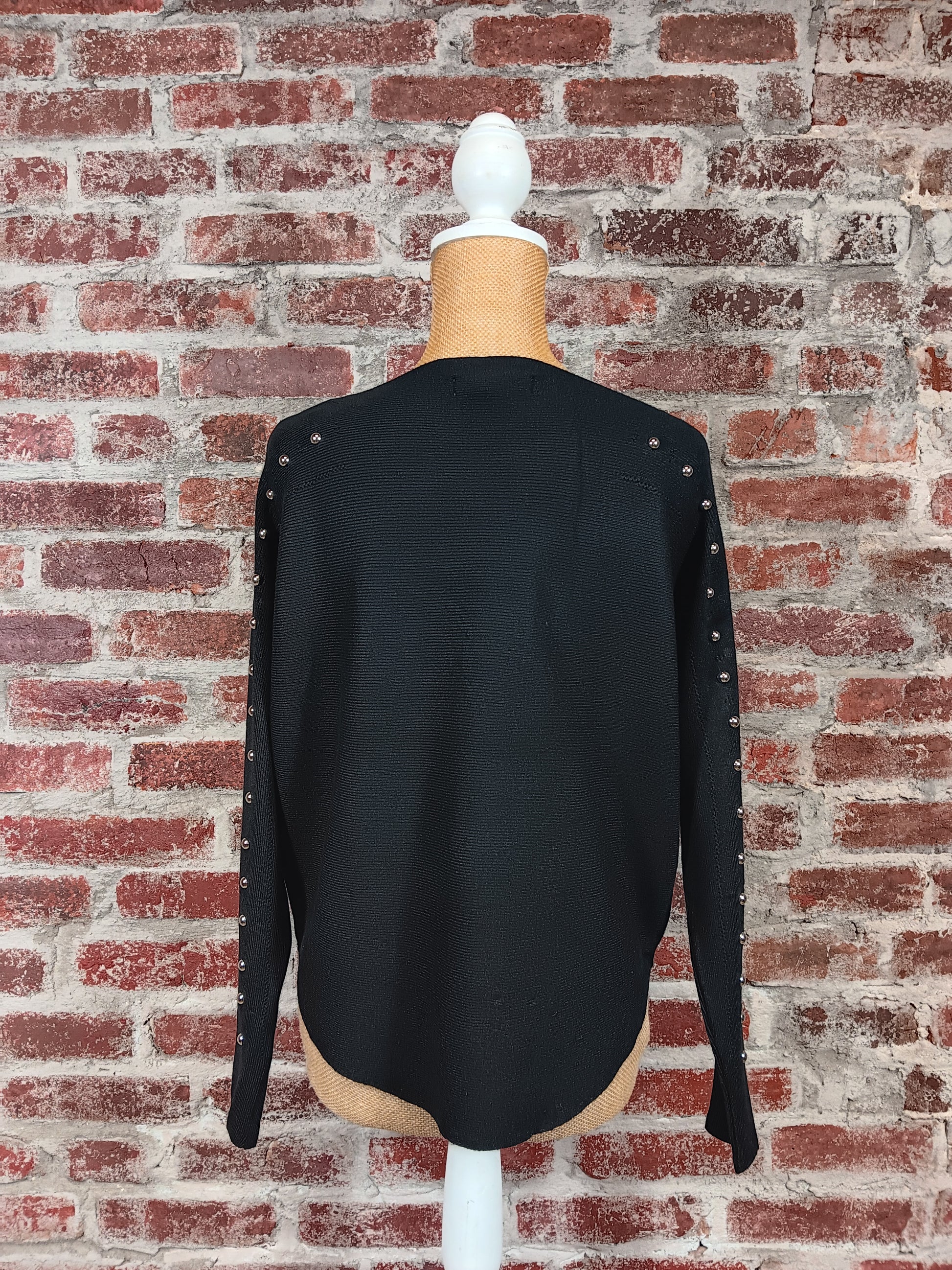 Gear up for the cold with our Black Pullover Sweater. The studded sleeves give this classic piece a modern, shiny spin. Made with 52% viscose, 28% polyester, and 20% nylon for a soft and warm fit.