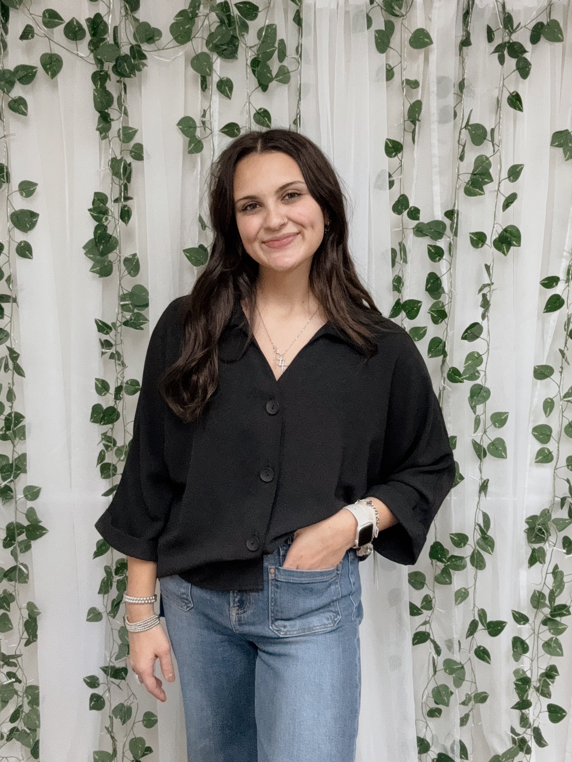 Kick your outfit up a notch with our Black Turn Up Cuff 3/4 SLV Shirt. Its sleek black fabric, button-up design, and classy collar make this shirt a modern masterpiece! Made with 95% polyester and 5% spandex.