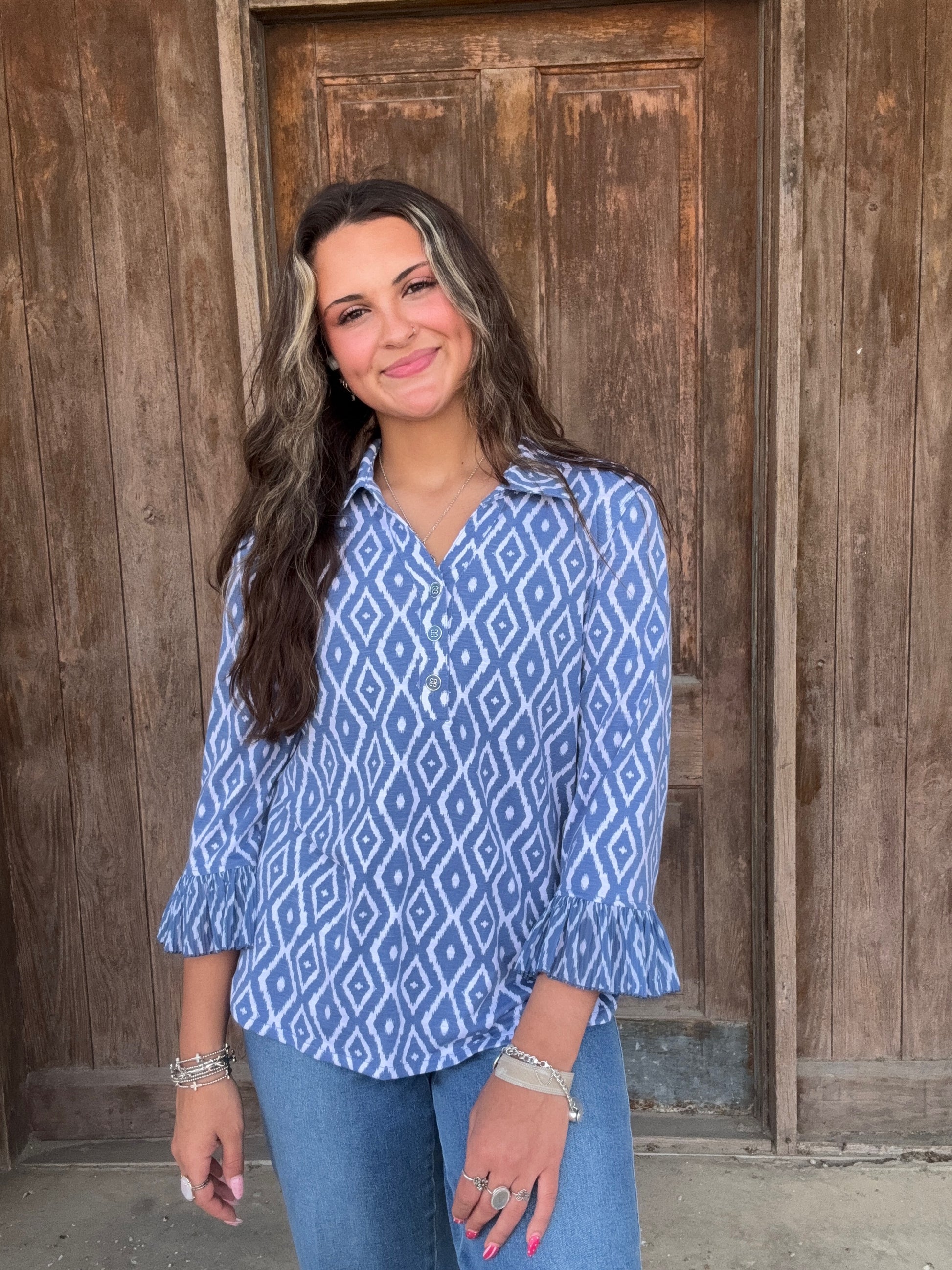 This printed slub jersey knit top blends comfort with refined detail, featuring a flattering Y-neckline with a soft collar and a pleated flounce front for added movement and style. Designed with 3/4 sleeves and a lightweight pull-over fit, it offers an easy, polished look that transitions seamlessly from casual days to dressed-up moments.