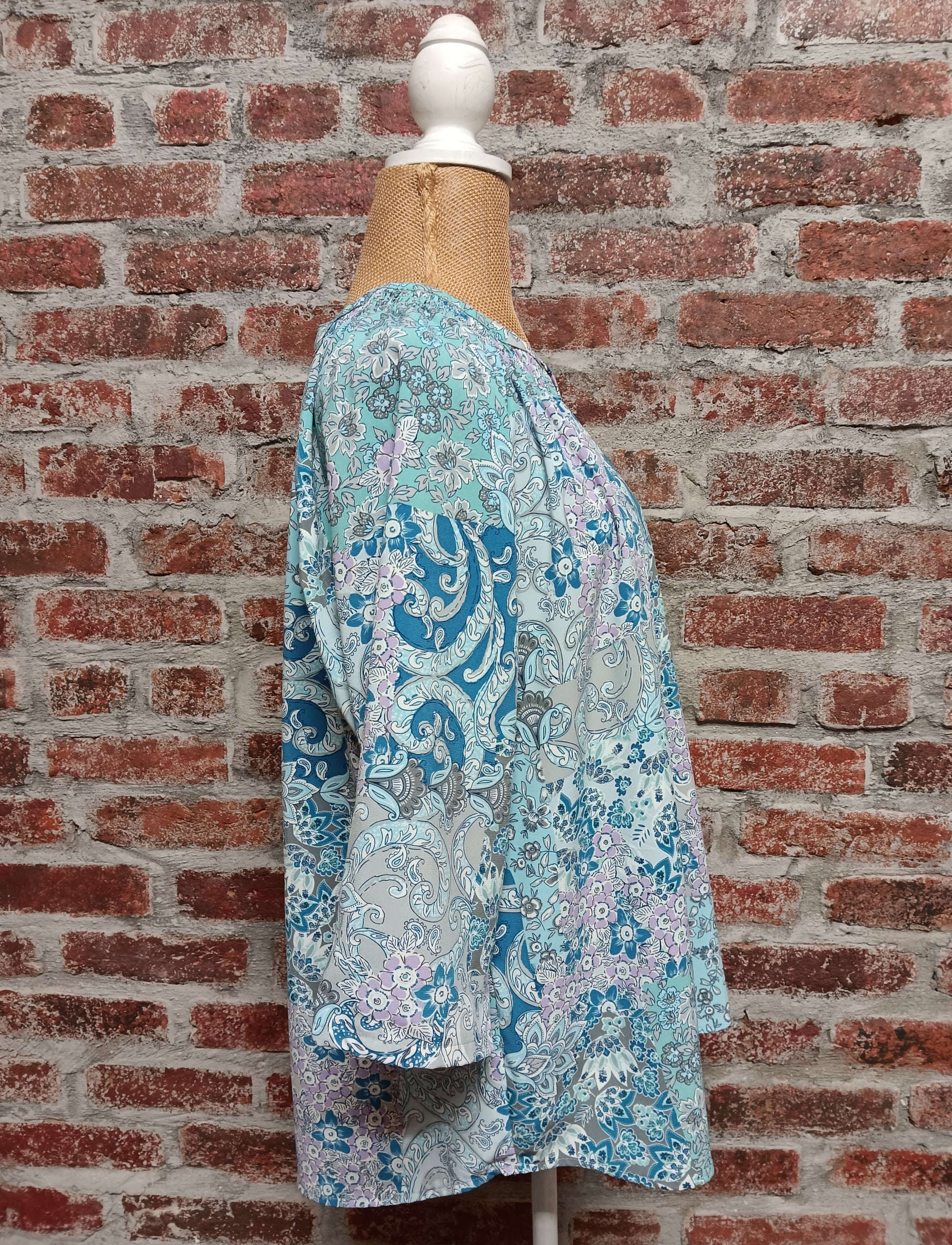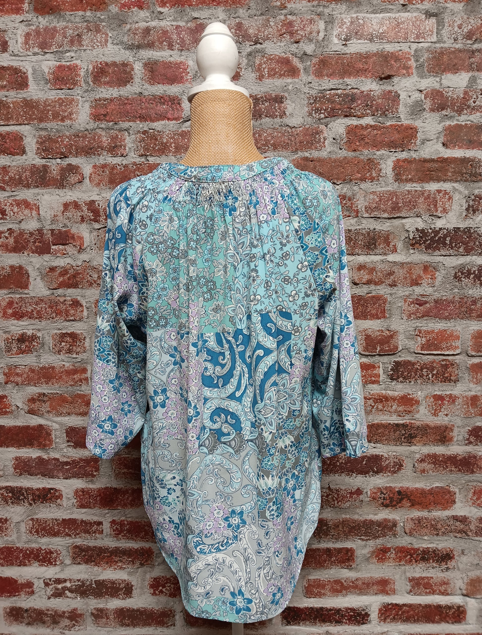 Blue Multicolor Floral Top 3/4 Sleeve Smocked Neckline