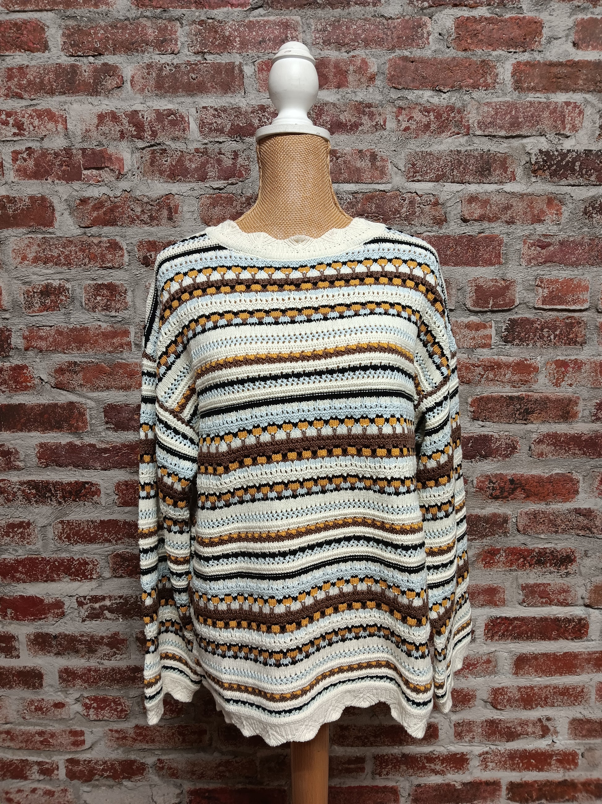 Get ready for ultimate comfort with our Cream and Brown L/S Pullover Sweater! Its striped patterns and knitted design make it a versatile piece for any wardrobe. Made with 60% cotton and 40% acrylic for a cozy warm fit.