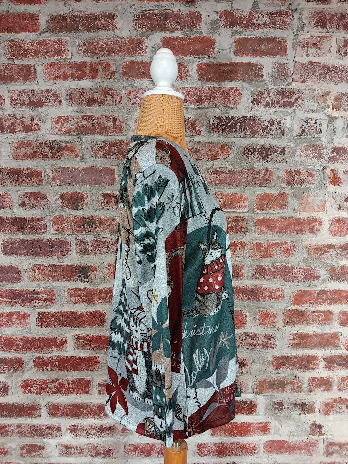 This fun and whimsical top embodies a certain Christmas coziness that gets you nostalgic, featuring a print of trees, ornaments, and cats! Made with a lightweight blend of 96% polyester and 4% spandex, this top keeps you warm, yet doesn't weigh you down.