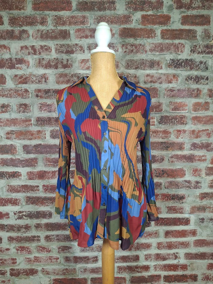 Add a splash of color and whimsy to your wardrobe with this multicolored abstract blouse. Its flowy fabric and playful bell sleeves create movement and fun, while the button-up front gives you versatile styling options. Lighthearted and lively, it's the perfect top to brighten any day!