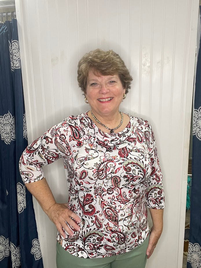 Elevate your wardrobe with the Paisley 3/4 Sleeve Pull On Top, featuring a stylish layered neckline that adds dimension and flair. Designed for comfort and ease, its pull-on style and flattering 3/4 sleeves make it perfect for any occasion. This top combines effortless elegance with everyday practicality, ensuring you look polished and feel confident all day long.