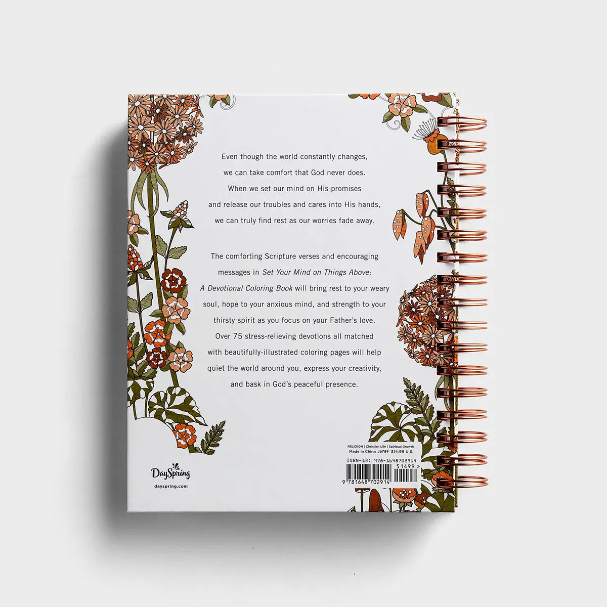 Set Your Mind on Things Above: A Devotional Coloring Book provides a wonderful way to turn your thoughts from worry and fear, and toward God's hope and peace. Matching over 77 stress-relieving devotions with beautifully illustrated adult coloring pages with floral and pattern designs. This spiral bound coloring book is the perfect outlet to creatively express your faith. Just grab your favorite artistic media, crayons, colored pencils, marker pens or paint and escape into the quiet peace of the presence of God.