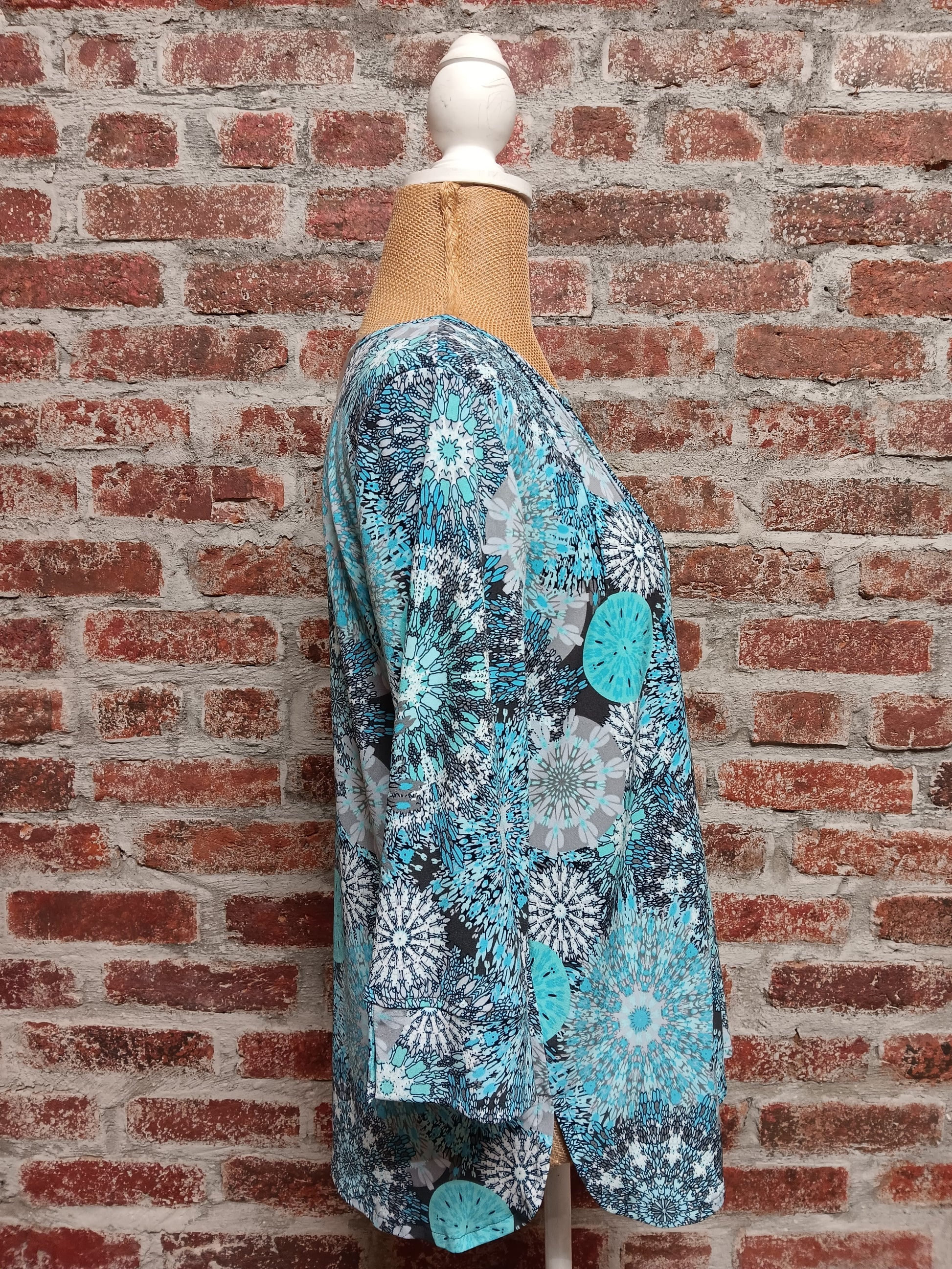 This Turquoise/Gray Geometric Print Top makes for a sophisticated piece with its rounded hemline and abstract pattern. Made with 95% Polyester and 5% Spandex. Machine wash, tumble dry low.