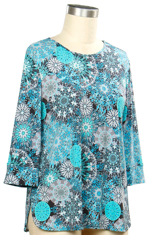 Turquoise/Gray Geometric Print 3/4 Sleeve Top With Pintuck Neckline